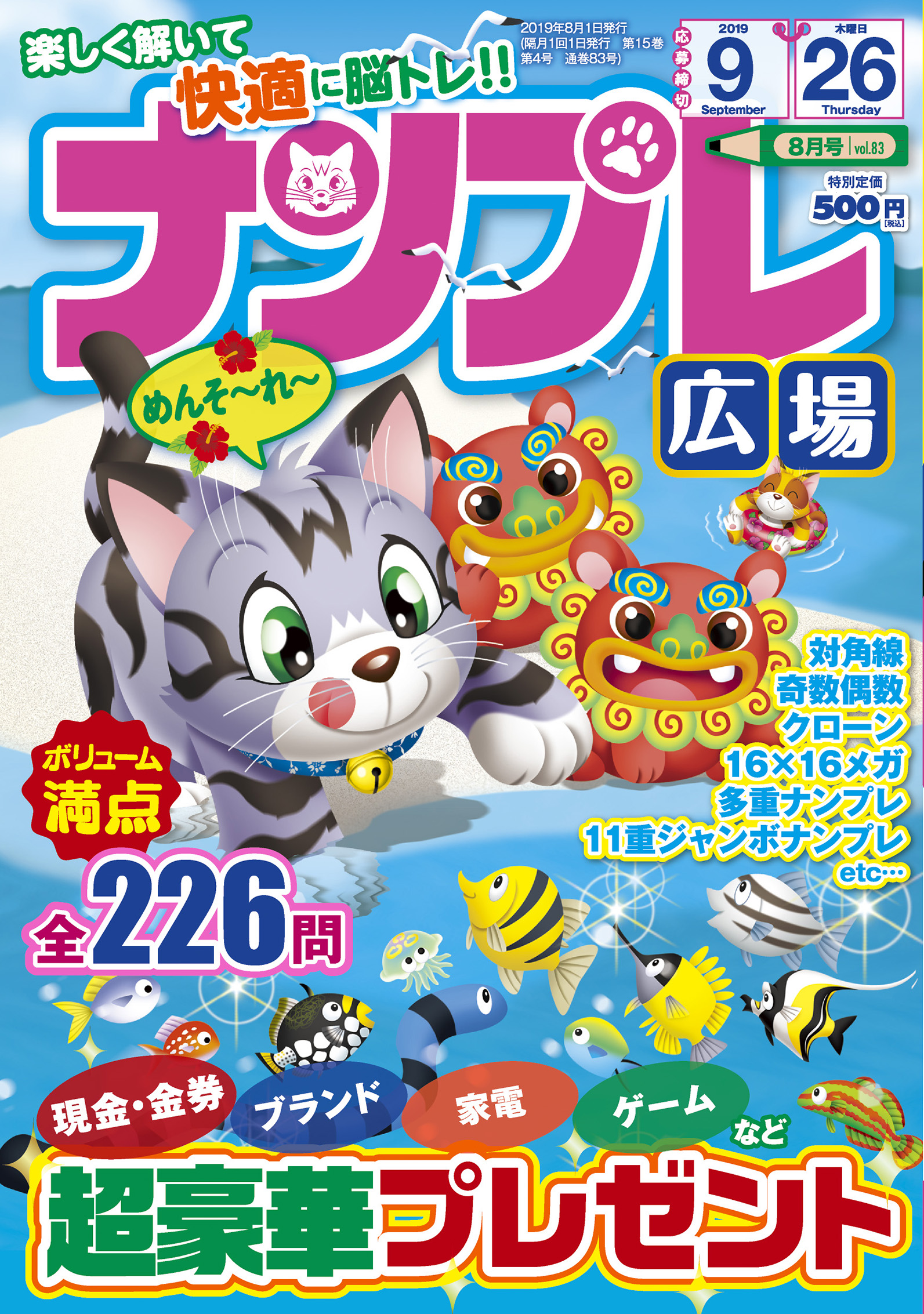 今号は対角線、奇数偶数、クローン、サムナンプレなどに加え、難問ナンプレ、ジャンボナンプレなど解きごたえのある問題が全226問! 夏の暑さもナンプレでクールに爽快! プレゼントもGETしちゃおう!