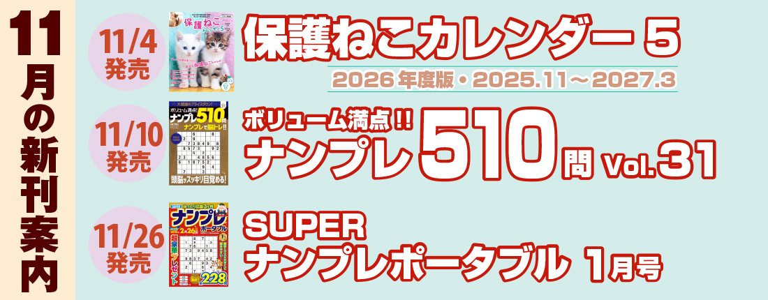 『大きな数字で見やすいナンプレ』は諸般の事情により2025年1月27日発売の“Vol.31号”で休刊となりました。それにともない『大きな数字で見やすいナンプレ Vol.31』の解答をホームページにて掲載させていただきます…